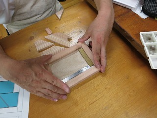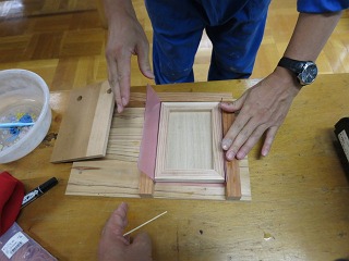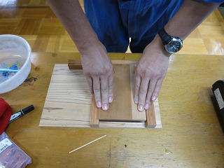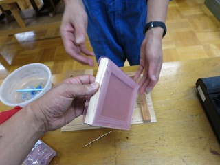 雄型(作ったケースの試作品を使用)と雌型(板に三方の枠を取り付けたもの)を使って形を作る。