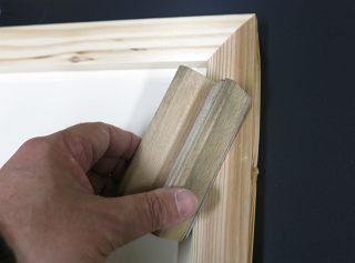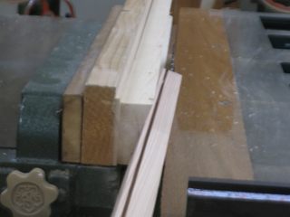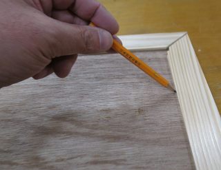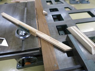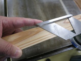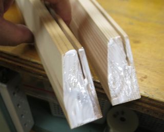 額縁の枠になる材料加工。斜めにカットするようにジグを製作。材料は県産のスギ材。