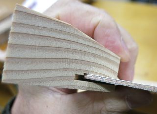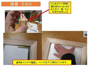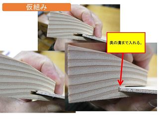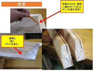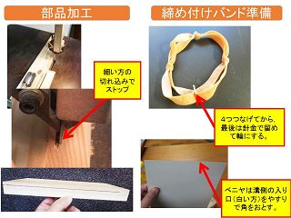 組み立て時は,紙を入れる溝に「くさび」を入れること,スコヤで確認することを伝える。(みな木工製作の経験があまりないので)