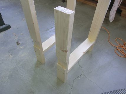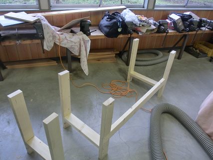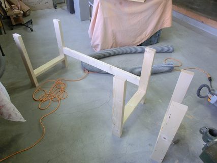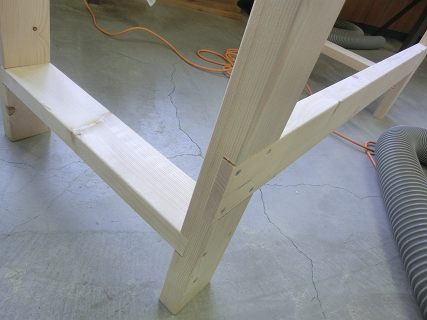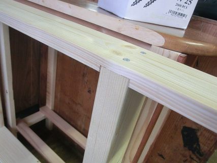 まずは,2×4材で足をつくる。両側に枠を作ってから,おくにぬき板を渡す。相欠きにしてコーススレッドで固定する。