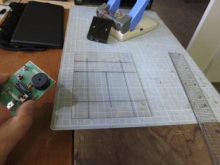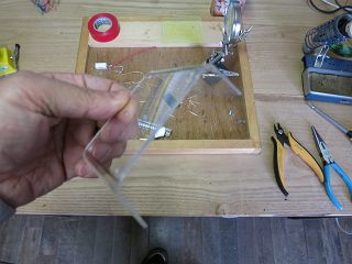 今度の物はPET材をはさんで両面に基板と電池ボックスを付けることにしてみた。アクリル曲げ機も年代物だがしっかり動作する。