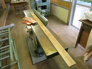 それを基準面の2面を手押し鉋盤で作った後,300mm(自動鉋盤で使える長さの最小限度)で切断して1人分として授業に備えた。