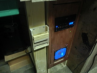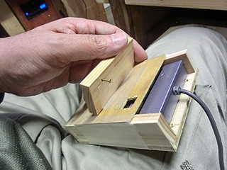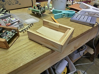そこに木で作ったボタン?を取り付ける。丁番を使わずに養生テープで取り付けてしまった。キーを押すのは真鍮釘