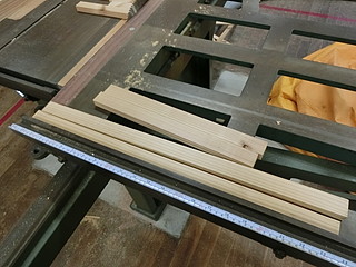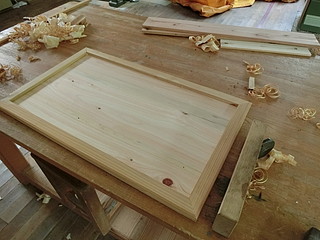 額縁はスギ板で作成。ルータやトリマはないので溝だけを横切り盤でひいて、角は45度に切断。