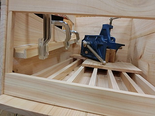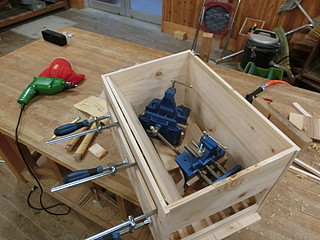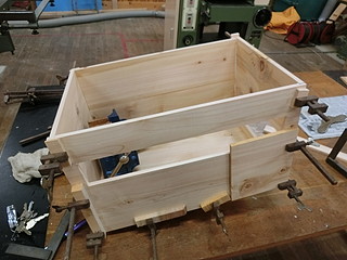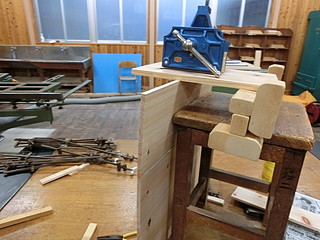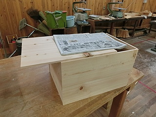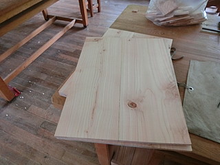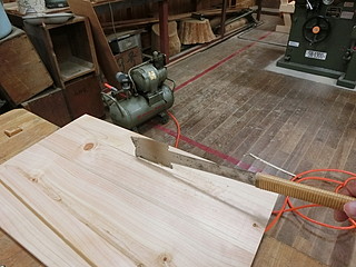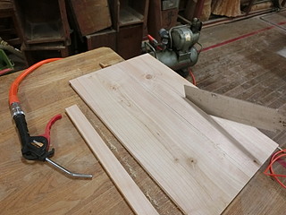 ヒノキの板を張り合わせて素材を作る。屋根部分は大きすぎてハタガネが届かないので重りを載せて張り付ける。