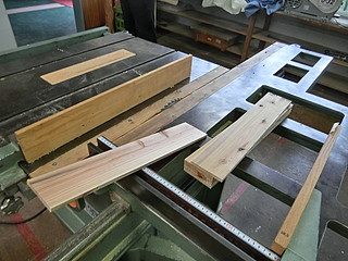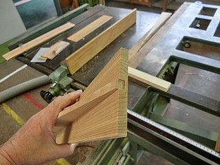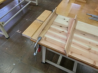 同じ板で脚を作る。溝を入れたところへ斜めに切った板を差し込んでボンドで固定。