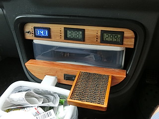 ダッシュボードの枠は、100円ショップの引き出しと室内外の温度計、バッテリー電圧表示を組み込んだ。