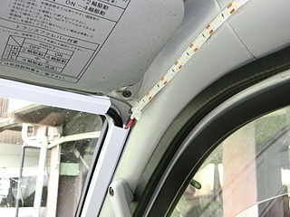 室内灯が暗かったので、12V用のテープLEDを天井周りに配置、デコトラ並に明るくなった。