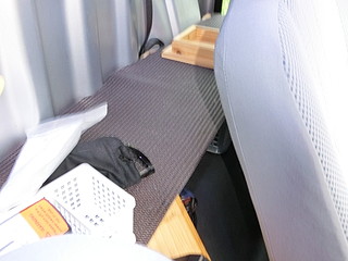 シート後ろのスペースには板を渡して棚を作る。タコメーターはどうしてもほしかったので、レーダー探知機を購入してOBDUアダプターを介して情報を受けて表示。