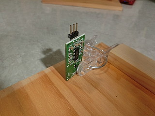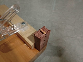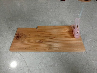 今回は以前から持ち帰らずに置きっぱなしになっていた生徒作品(自分が来る前のものですが・・・)を分解した材料を使って製作。洗濯ばさみは縦と横に取り付けた。前回はあり合わせのスギ板で作ったので、今回は横位置に基板をはさんでも周りにはみ出ない大きさに。