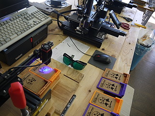 レーザ加工はコルクシートを貼ってから図案を焼き付ける。コルクなのでレーザ出力や加工時間を抑えることができる。