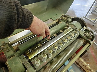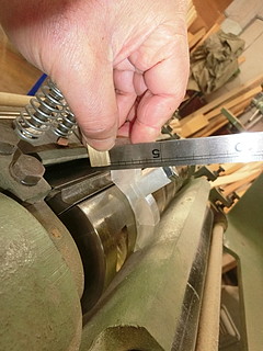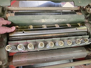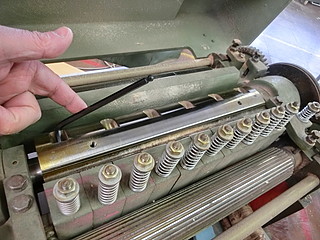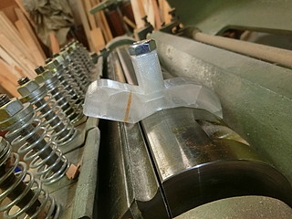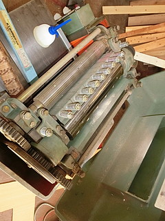 学校の木工室にある自動鉋盤、授業でも使うので年に一度は刃を研いで交換したいところ。