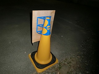 プラスチックのコーンに差し込むような形にして、表示部はA3の大きさの板を校務技師さんに切り出していただいた。