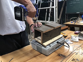 2つ余っていたので、壁方向に加えて天井から机に投影する方向にも取り付けてみた。