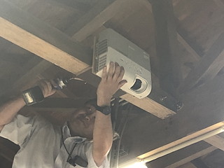 古いプロジェクターでVGA入力しかないので、HDMI→VGAの変換器を取り付けて7mのHDMIケーブルによって接続する。