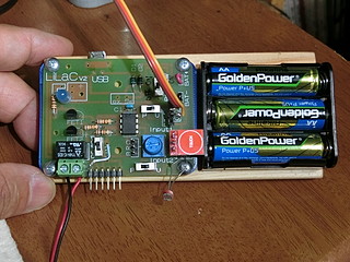 ライラックにプログラムして完成。AND側では、夜に人感センサーが反応するとレリーズ。OR側は光センサーにタッチスイッチを並列に接続して、指で触れるとレリーズするようにした。
