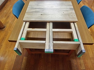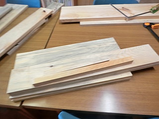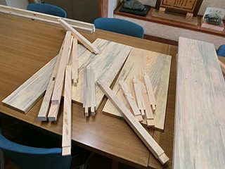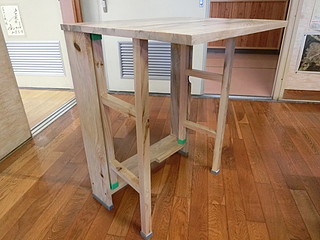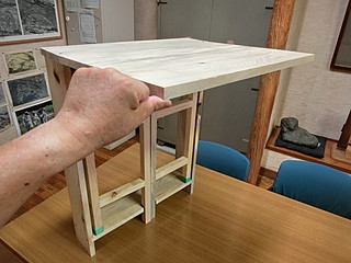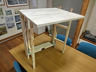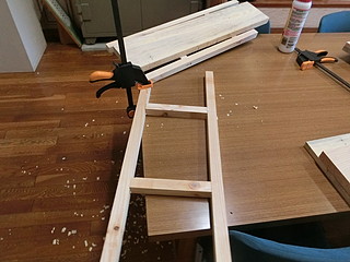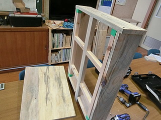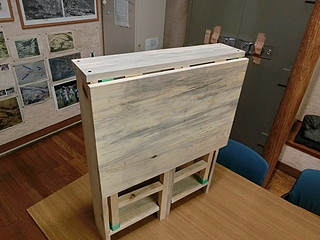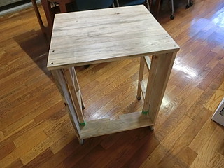 組み立てたところ。天板は中学校のハタガネを借りて木工ボンドで接着して幅を広くしてきた。