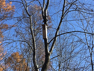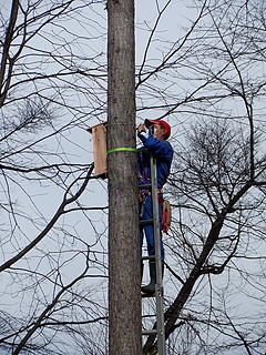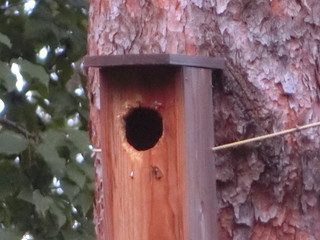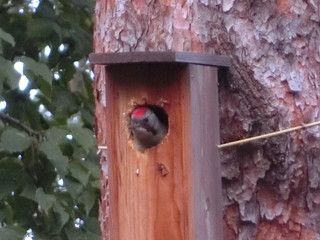 表面に貼った木の皮をつついて穴を開け、アオゲラやアカゲラがやってきました。