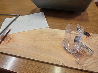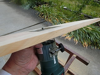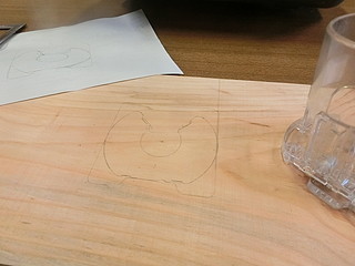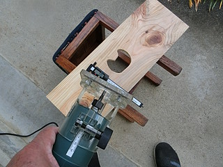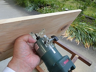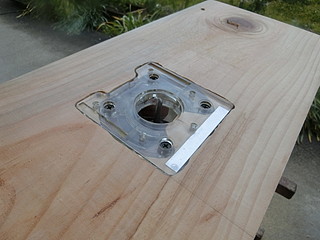 トリマに附属しているガイド枠を写し取って、厚み分だけトリマで彫り込む。