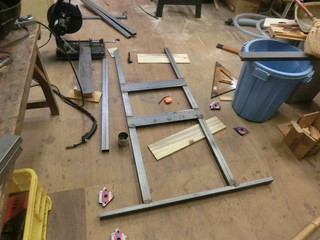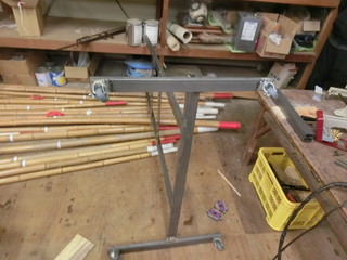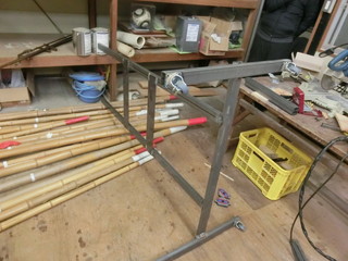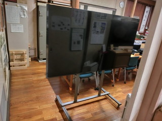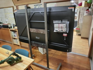 このほど、地元企業の寄付により75インチの大型テレビモニターがやってきた。 自校で選択できたので、テレビ台がなくてもモニターの大きさにお金を振った。 重さは25kgとそれほど重い物ではないので、二本足の台を角パイプで製作することにした。 50mm×28mm長方形断面の角パイプ。足にはキャスターを溶接する。 背面の固定部は200mmの正方形になる形、フラットバーを渡して穴を開ける。 卒業式後の時間に、ボールなどが当たっても壊れないように可動式の鉄枠を付ける予定。 そのために、上側まで柱を伸ばしてある。 とりあえず、残りの授業で使えるように、中途半端だけれど体育館に導入した。